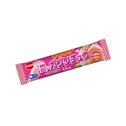 噛んで食べられるバータイプのソフトキャンデーです。歯につきにくく、心地良い噛み応えが長く続きます。山梨県産白桃果汁を配合。口に入れた瞬間から芳醇で濃厚な味わいを感じられる、ちょっとプレミアムな濃いガブリチュウです。